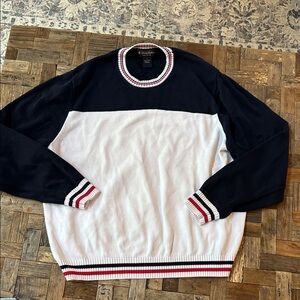 Brooks Brothers Men’s 100% Pima Cotton Oullover Sweater. White and blue Colorblock. Red, white & blue ribbing at neck, cuffs and waist.