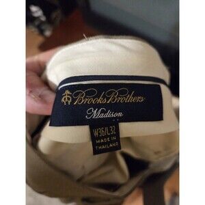 The Brooks Brothers Mens Dress Pants in beige, size 36x32, feature a straight leg chino style with a mid-rise fit. These lightweight pants are made from wool fabric with a canvas texture, making them suitable for various occasions including travel, casual wear, and business meetings. With a classic design and American theme, these pants are a timeless addition to any man's wardrobe, offering both style and comfort for all seasons. Perfect for completing a sophisticated and polished look.