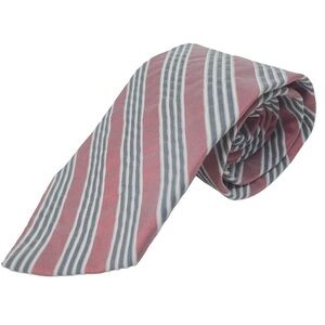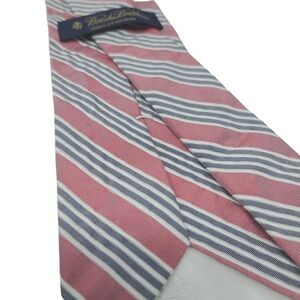 Men's striped necktie by Brooks Brothers Makers & Merchants. Red/pink, white and gray diagonal stripes. Necktie in excellent pre-owned condition; no flaws.