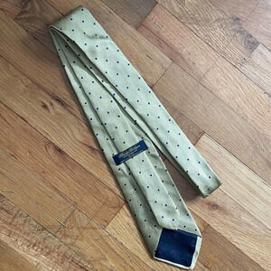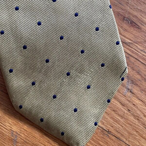 Gold with navy polka dots. (Gold is deeper / brighter) than my photos show. Potential small flaw on top of tie as shown. Sold as is.