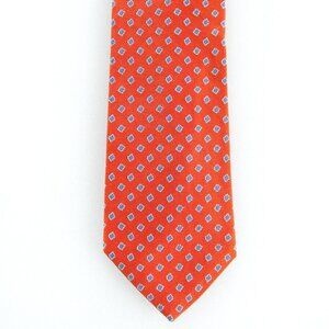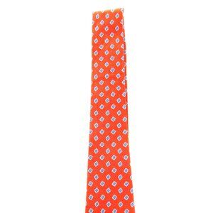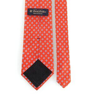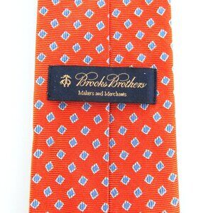 Description: Up for sale is a Brooks Brothers men's narrow silk tie. The tie is handmade in the USA of 100% silk. The tie has a small print design in blue & white on an orange-copper colored background. Dimensions are approximately 58" long x 3 5/8" wide. This tie is in excellent condition.