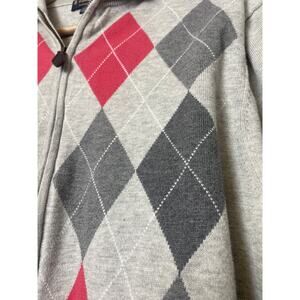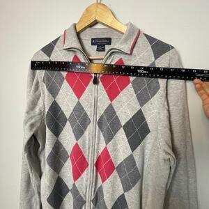 Details/Style Profile: Very nice men's Premium brand Brooks Brothers full zip cardigan. Argyle print with red and two tones greys. Supima cotton- soft. Has two zipper