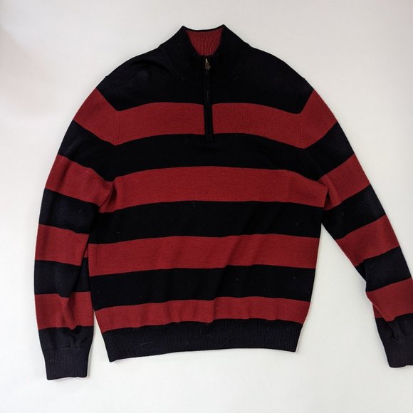 100% Merino wool sweater from Brooks Brothers. Quarter zip with chunky blue and red stripes.