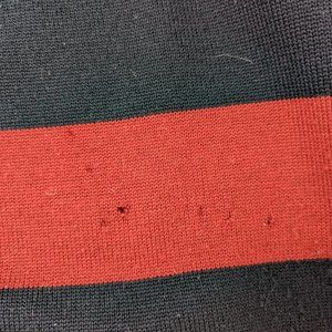 Some wear on the back right hip area and a small moth hole ~1/4 inch across.