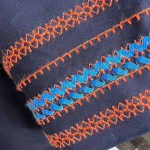 Brooks Brothers NWT navy blue short sleeve structured/ tailored embroidered sleeve top size 10P. Style 100067789. Orange and blue embroidered sleeves. Zipper back. Fully lined. 98% cotton 2% spandex. Lining 100% cupro. Length 20.5” Chest 19”.