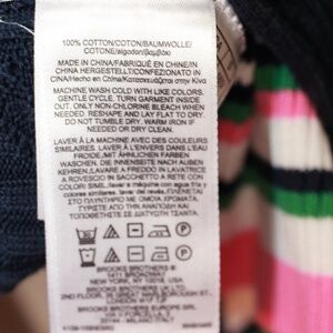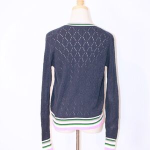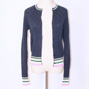 Brooks Brothers navy cable knit cardigan with pink, green, and white striped neckline, hem, and cuff of the sleeve.