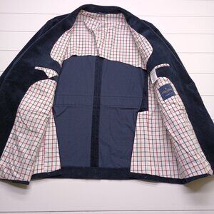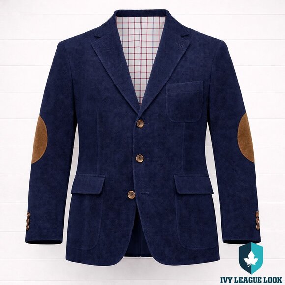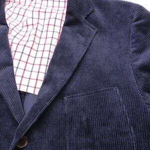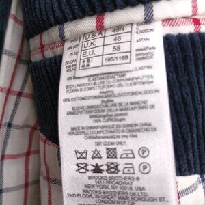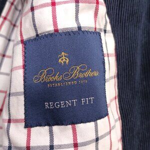 Classic Brooks Brothers navy corduroy blazer in the traditional Regent Fit. Features suede elbow patches and a timeless checked lining for a refined Ivy League look. Ideal for smart-casual wear, fall layering, or classic collegiate styling.