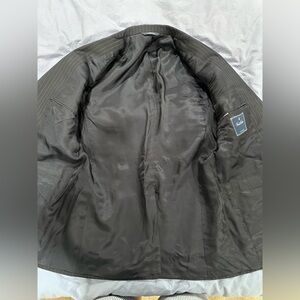 Brooks Brothers navy pinstripe suit, made in America at the old Hickey Freeman (now Rochester Tailored Clothing) factory in New York. This blue label was the mainline label before they switched to the 1818 line. Fit is slimmer, likely equitable to the more recent Milano fit of suits (slim but not skinny). Suit is in like new condition, with no noticeable blemishes or wear marks.