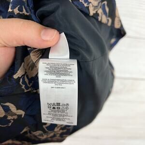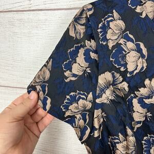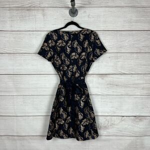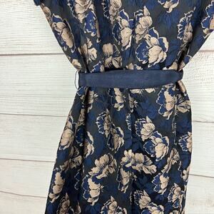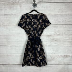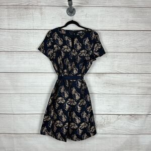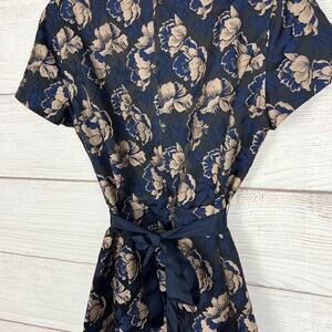 Elegant navy dress with beige floral pattern. Short sleeves and belted waist. Perfect for any occasion.