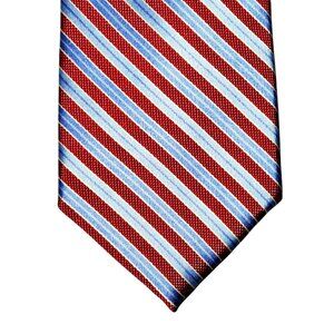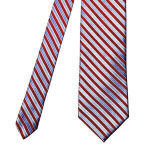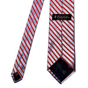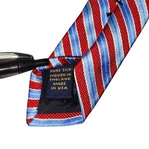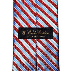 This Brooks Brothers stain resistant necktie is in excellent pre-owned condition. No holes, stains or damage. 100% silk, woven in England, made in USA. Red, blue (two shades), silver and black colors, striped pattern. Colors may vary slightly due to lighting, fabric textures and computer/mobile settings.