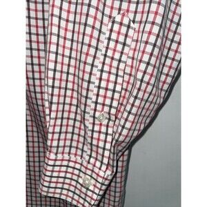 The product is a men's Brooks Brothers Original Polo Button Down Shirt in size L. It features a red, grey, and white check pattern with a collared neckline and button-down closure. The shirt has long sleeves and a regular fit. It is made of breathable cotton material and is machine washable. The shirt is suitable for all seasons and occasions, including travel, parties, and casual wear. The shirt is accented with buttons and has a button-down collar style. It is a woven shirt and was manufactured in Malaysia.