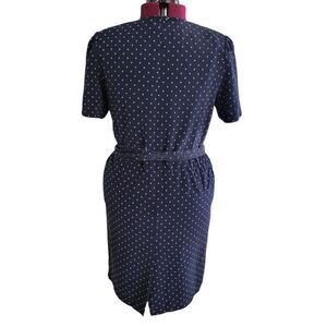 This vintage Brooks Brothers dress is crafted from 100% silk, featuring an elegant navy blue polka dot design. The belted waist accentuates the silhouette, while the short sleeves and lightweight fabric offer timeless sophistication. A versatile piece exuding classic charm. In great vintage condition.