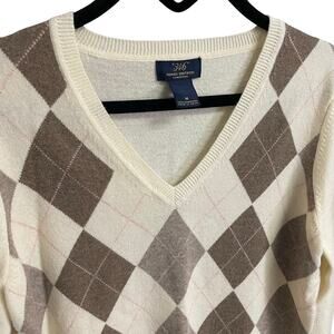 Brooks Brothers Pure Lambswool V Neck Argyle Sweater Cream Brown Medium AS IS