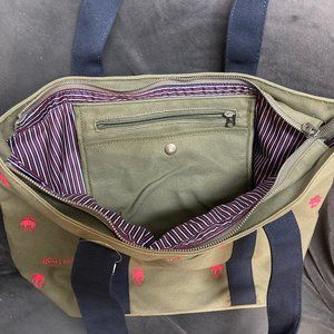 A Brooks Brothers "Red Fleece" brand green cotton tote bag with logo in red. It's 18 inches wide, 11 inches tall and the handles extend 8 inches. Zippered opening into striped interior with two pockets- one zipper and one snap. Also outside zippered pocket. Excellent condition - never used.
