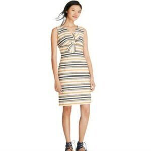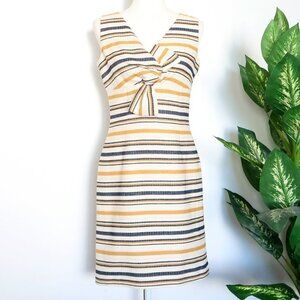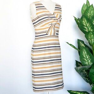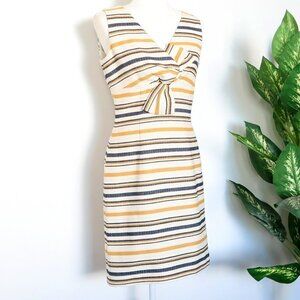 This highly flattering sheath dress from Brooks Brothers will make you look polished in every setting, from morning meetings to evening events, and everything in between. The stripe pattern is in a beautiful color combination - white, cream, mustard yellow, and navy blue. What makes it particularly attractive is the twisted detail/bow at the V-neckline.