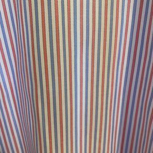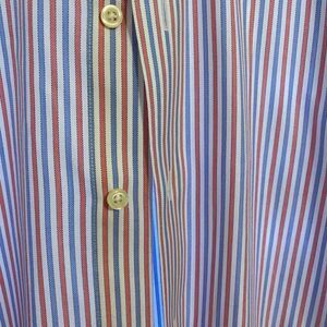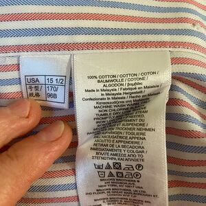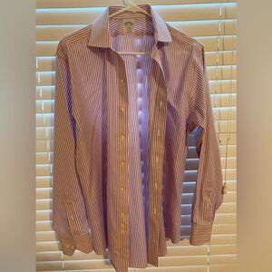 This Brooks Brothers Regent fit dress shirt is unworn and in excellent condition. Size 15.5. Features a coral and blue stripe pattern, long sleeves, collared neckline, French cuffs, and a box pleat in the back. Made of 100% American Supima cotton in Malaysia.