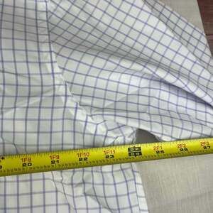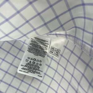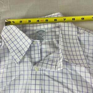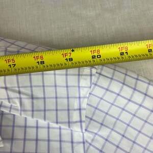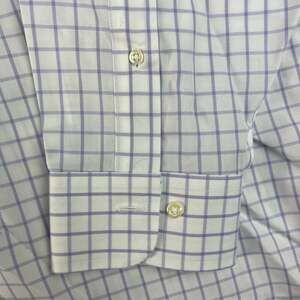 Brooks Brothers Regular Fit Dress Shirt, 100% Cotton, Non-Iron. This classic men's dress shirt features a crisp white background with a subtle lavender grid check pattern, perfect for business or formal casual wear. Made with non-iron fabric for easy care. Excellent pre-owned condition, no visible flaws. Made in Vietnam, 1818 line. Features a regular fit with a 17 1/2 inch neck and 32/33 sleeve length.