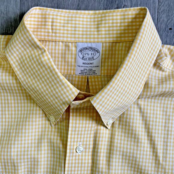 Brooks Brothers Regent Shirt Men's Size 17.5-33 Yellow White Check Non Iron