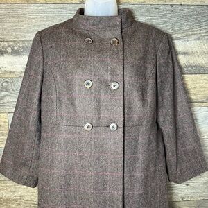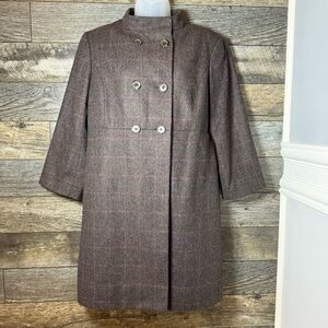 In excellent, flawless preowned condition. In classic swing coat style with 3/4 sleeves and high neck. Coat has a snap at the neck and is double breasted. Material made in Scotland and assembled in China and is a mid weight not light but not heavy. Legit has it all. Classy and classic.