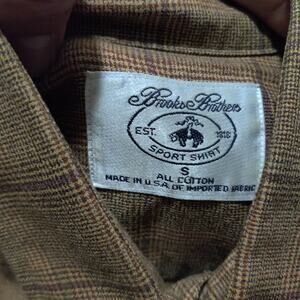 This Brooks Brothers shirt is a vintage men's button-up with a light brown flannel plaid pattern. Made of cotton flannel, it features long sleeves, a collared neckline, and button accents. The shirt is machine washable and suitable for travel or casual occasions. With a regular fit, button-down collar style, and classic features like button cuffs and made in USA design, this shirt is versatile for all seasons and can be styled for a flower or USA theme. Perfect for those who appreciate quality and timeless style in their wardrobe.