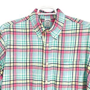 Elevate your wardrobe with this classic and preppy Brooks Brothers button-up shirt. The shirt features a green, pink, and yellow plaid pattern, long sleeves, and a collared neckline with a button-down closure. It is made of breathable and machine-washable linen fabric, which makes it perfect for all seasons and occasions such as travel, parties, or casual wear.