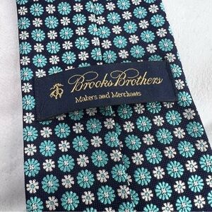 An exquisite Brooks Brothers silk tie featuring an intricate floral medallion motif in sophisticated shades of turquoise, teal, and white against a rich navy ground. This is American luxury haberdashery at its finest.