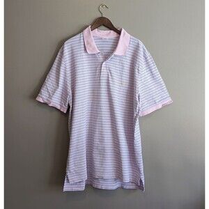 Performance Polo from Brooks Brothers. Made of 100% cotton. Short sleeve pink with blue white stripe top. There is a very small blue dot on the bottom third of the shirt. I can't tell if it is a spot or fabric. See the pictures for more details. Aside from that, the shirt is in excellent pre-owned condition. It is about 31" long and 25" armpit to armpit. Buy with confidence. Your satisfaction is my priority. Ships fast and comes from a smoke-free home.