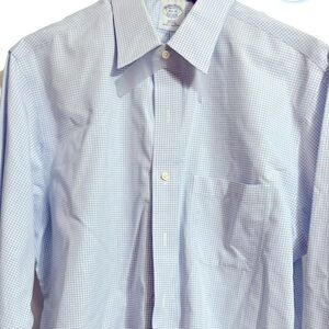 This Brooks Brothers dress shirt in a sophisticated blue hue is crafted for professional settings. Featuring long sleeves and a traditional pointed collar, it offers a timeless look suitable for business wear.