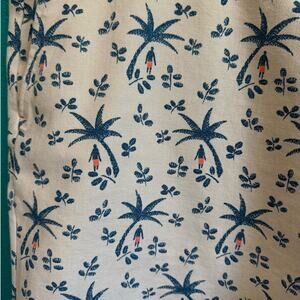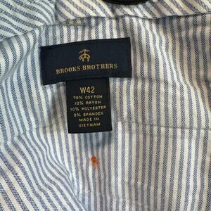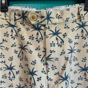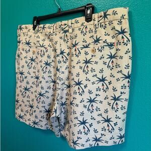 These tan and navy blue shorts are made by Brooks Brothers. These woven shorts feature a tropical print, zipper with double flap button closure and four pockets. These shorts are in good condition with no visible rips or stains. The inner hook closure is missing the loop. 78% cotton, 10% rayon, 10% polyester, 2% spandex. Style number 100208355. Made in Vietnam, men's size 42. Machine washable.