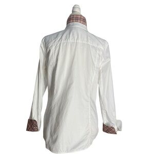 The Brooks Brothers Thom Browne Black Fleece Button-Down Shirt is a striking blend of classic tailoring and modern detailing. Crafted from premium materials, thisWhite button-down shirt features subtle yet eye-catching pink plaid accents on the placket, cuffs, and under the collar, adding a stylish pop of color to a timeless silhouette. With Thom Browne's signature design elements, this shirt perfectly balances sophisticated menswear-inspired style with a touch of feminine flair. Perfect for both professional settings and casual outings, this shirt is a versatile wardrobe staple that offers an elevated, polished look with a modern twist.
