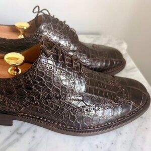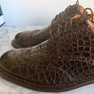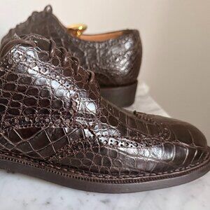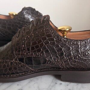 In the early 2000's Brooks Brothers carried these alligator wingtip shoes in brown and black. They retailed $2,500 and they have been worth every dollar. Beautifully constructed and finished, the alligator skins are beautiful and the fit is perfect. In size 10D and true to size