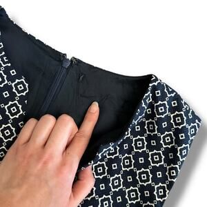 Classic Brooks Brothers sleeveless dress in size 2. Navy blue with white geometric print. Fit & flare cut with notched neckline, full lining, hidden zip back, and side pockets. 99% cotton with stretch for comfort. Pre-owned in good condition with a small stain near hem and some light wear at lining (see photos).