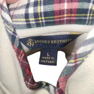 This elegant fleece vest tells a tale of timeless charm. With its cozy ivory fleece complemented by plaid accents, it embodies both comfort and classic style. Designed by Brooks Brothers, it invites warmth into your wardrobe while showcasing a unique flair of sophistication.