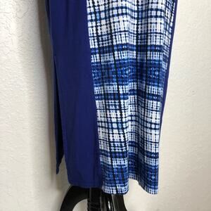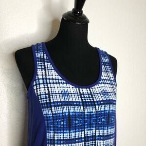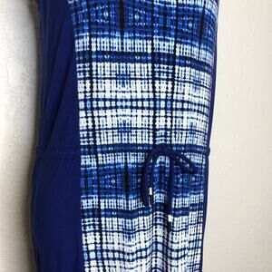 Brooks Brothers blue and white graphic print sleeveless drawstring waist dress. Pullover style with scoop neckline. Sleeveless with thick shoulder straps. Slits on the side at the hemline. Drawstring waist that ties in the front. Size large. Excellent pre-owned condition. Rayon spandex blend. Machine wash.
