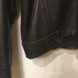 So On Trend!!! Super high quality! I can’t even describe how buttery soft this lambskin bomber jacket is…Feels like silk! Extremely supple, so it molds to you. Hipbone length makes it wearable as a jacket replacement at the office. Dark brown color....think dark chocolate. Clean zip front, button tabs at hem to adjust fit. EUC- perfect condition inside and out...no rips, gouges, stains, buttons and zipper in good working order.