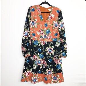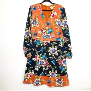 Brooks Brothers multicolor floral print dress fit and flare knee length with long sleeves and button cuffs zips up at the back 100% polyester.