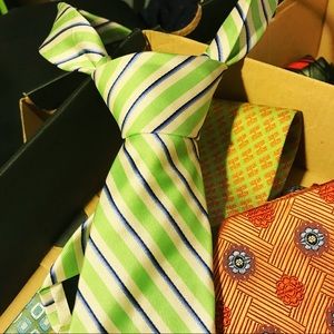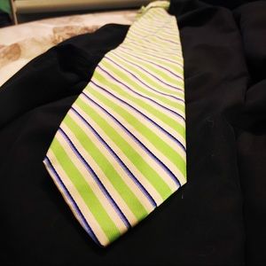 White , lime and baby-blue diagonal striped 100 % silk . Perfect condition