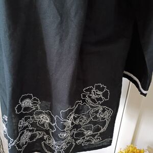 The product is a women's embroidered black tunic by Brooks Brothers, made of a linen and cotton blend. It features a floral pattern, 3/4 sleeves, a V-neckline, and a pullover closure. With a regular fit and size XL, this tunic is perfect for the summer, fall, and spring seasons. The brand's reputation for quality craftsmanship and stylish design makes this tunic a versatile and comfortable option for any woman's wardrobe. EUC no known defects.