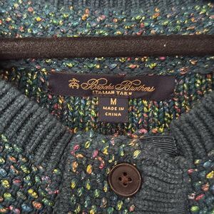 This elegant Brooks Brothers long sleeved cardigan combines luxurious Italian yarn with a touch of shimmer, thanks to its multicolored metallic threading.