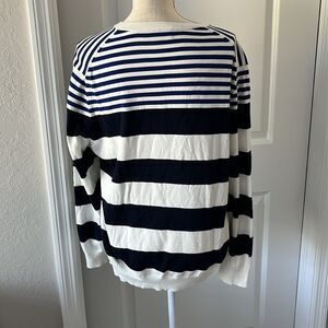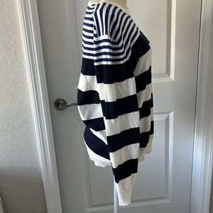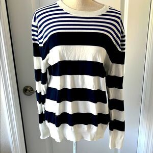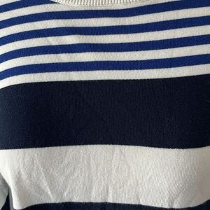features a relaxed, boxy fit with alternating blue and white stripes, offering a timeless nautical-inspired look. Crafted from soft knit fabric, it provides comfort and style, making it an ideal choice for casual wear. The long sleeves and crew neckline enhance its classic appeal, perfect for a laid-back day out.