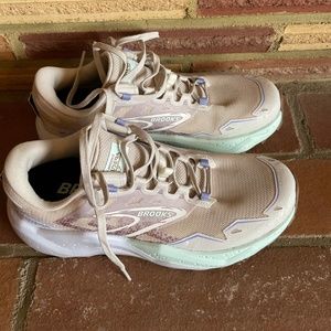 Almost brand new Brooks Caldera 7, in a women's size 9. These shoes have about 15 trail miles on them and do have faint mud spots on the upper. They come with the original insoles and will be packaged in a different box, as I chose not to take the box when I bought them from the running store.