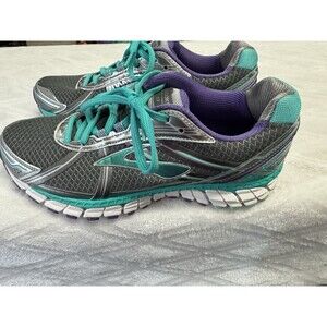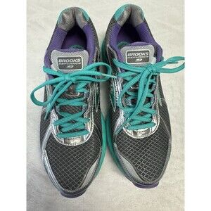 The Brooks DEFYANCE 9 Athletic Running Shoes in women's size 10 feature a lace-up closure, cushioned insole, and breathable design, making them ideal for cross-training and running activities. With a stylish gray and teal color combination and a blend of synthetic fiber and synthetic leather materials, these sneakers offer both comfort and durability. The Brooks brand is known for its quality athletic footwear, and the DEFYANCE 9 model ensures a supportive fit with its B width and synthetic fiber and leather upper and lining materials. Perfect for active women looking for reliable and stylish athletic shoes.