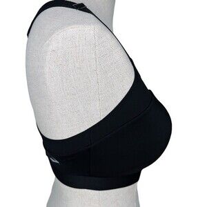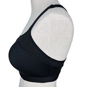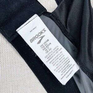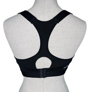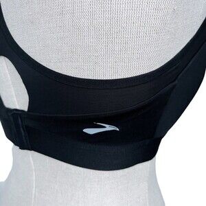Women's Brooks Dare Racerback Run Bra, size 34E. In excellent condition with minimal visible wear (logo printed on band is peeling up at one side, no impact to wearability). Solid black color. This racer back, wire-free bra delivers run-ready support with built-in molded cups that are perforated to allow for better moisture wicking, while adjustable straps and rear closure fine-tune your fit. Sweat-wicking, quick drying fabric. Back closure has 4 rows of 3 hooks.