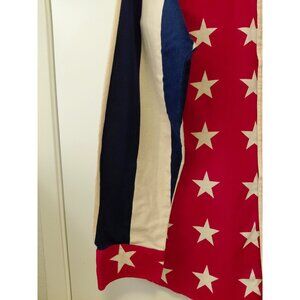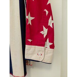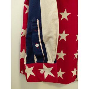 The Brooks & Dunn Vintage Panhandle Slim USA Flag American Button Down Shirt is a stylish and patriotic addition to any man's wardrobe. Made from 100% cotton, this shirt features a classic collared neckline, long sleeves, and a button-down closure. The red, white, and blue striped pattern adds a touch of Americana flair, perfect for casual occasions year-round. Chest measures 48" length 31". Great condition other than small area that is pulled some, not very visible. See picture #8.
