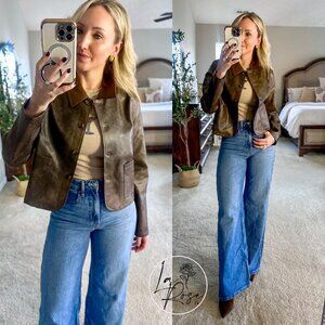 Classic meets modern in this sleek Brooks Faux Leather Long Sleeve Cropped Jacket. Designed with a structured silhouette and a soft, lived-in finish, it’s the perfect layering piece for any season. The contrasting collar detail adds a touch of sophistication, while the button-front closure and front pockets keep it timeless and functional. Dress it up with tailored pants or pair it with denim for an effortlessly chic look.