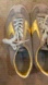 Stylish Brooks sneakers with gold accents and tan fabric. Ideal for casual wear.