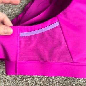 Beautiful Magenta high neck running bra. Pockets in back between shoulder blades and under armpits. Seamless design in back makes for a very smooth fit. Removable pads included. I can’t find a size tag to photograph but it is a 36E.