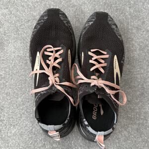 Color: Black/gray knit upper with light pink laces and cream Brooks logos; black midsole/outsole with pink LEVITATE heel pull tabs