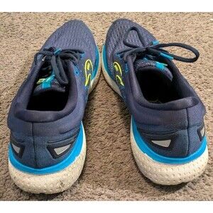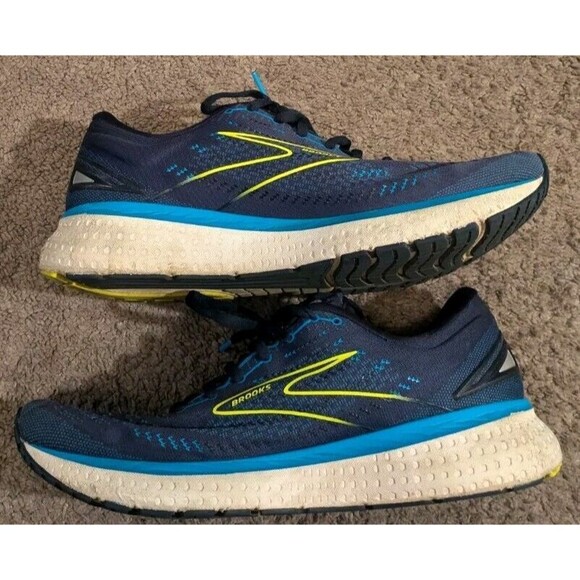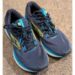 Stylish Brooks athletic shoes. Navy upper with neon yellow accents. Comfortable and durable design. Plenty of tread left.