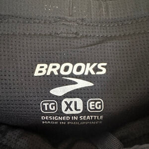 These pre-owned Brooks running shorts, size XL, are black and made of 100% polyester. They feature an elastic waistband with a gray drawstring, a small back zipper pocket, and side pockets. The shorts have a reflective Brooks logo on the right leg and reflective stripes on the sides. The waist measures approximately 22 inches across, and the inseam is about 7 inches. There are no visible stains or tears.
